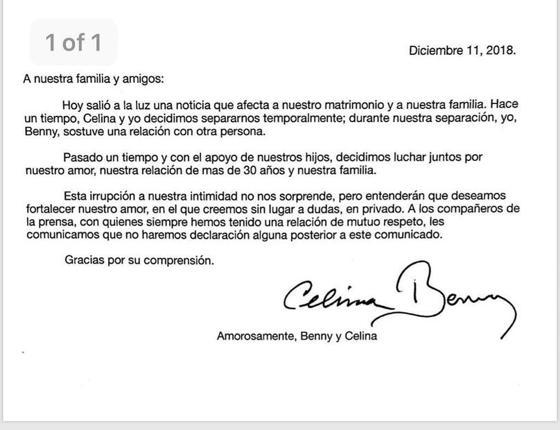 Mediante un comunicado, Benny reconoció que hace un tiempo se separó temporalemente de Celina y que durante se lapso salió con otra mujer. Sin embargo, aclaró que nunca se trató de una infidelidad, pues a pareja decidió luchar por el amor que mantienen de hace 30 años y ahora se encuentra junta.