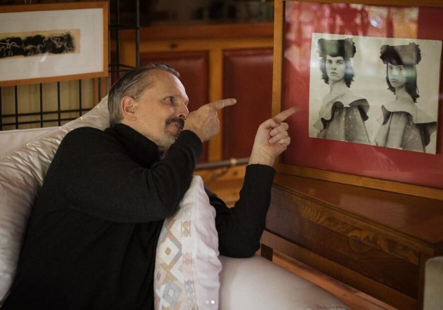 Sentando en un sillón blanco, rodeado de cojines y apuntando a un cuadro en el que aparece una foto de su juventud, Miguel Dominguín Bosé, mejor conocido como Miguel Bosé, luce contento y relajado mientras viste un jersey negro de cuello alto con pantalones caquí.