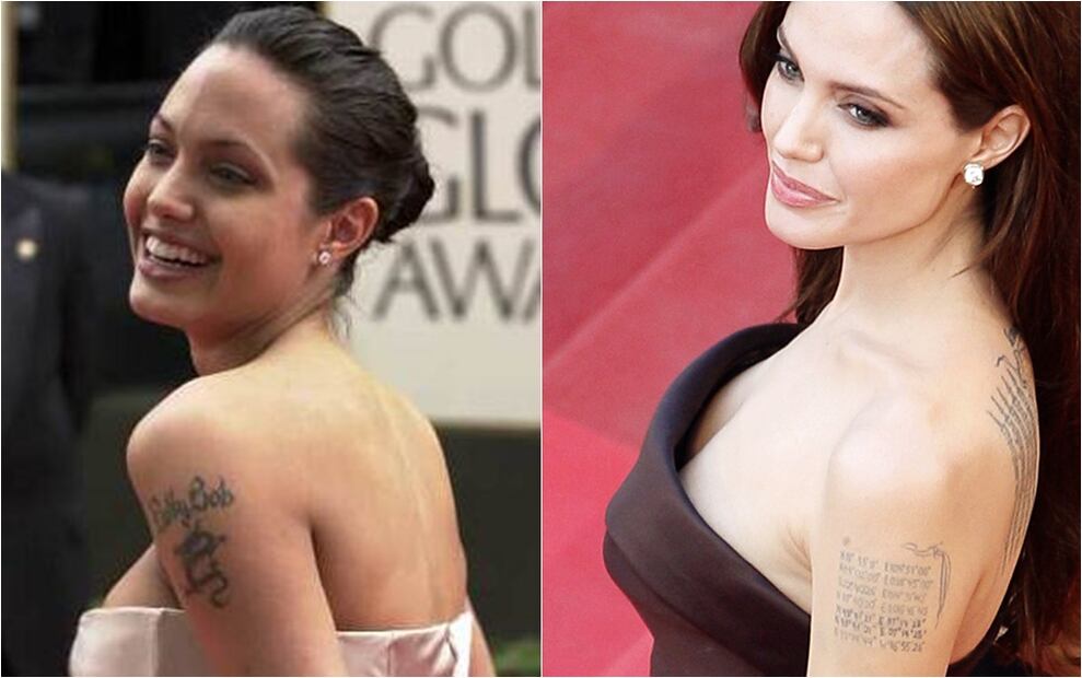 La actriz se tatuó en el brazo el nombre de su ex marido Billy Bob, después del truene se lo cubrió con las coordenadas de los lugares donde nacieron sus hijos.