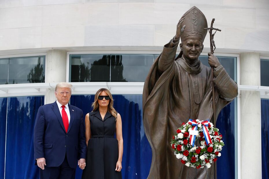 Ahora se ha hecho viral un video que muestra a la exmodelo de origen esloveno durante una visita junto al político al Santuario de San Juan Pablo II de la Universidad Católica de América en Washington DC, en donde muestra un momento incómodo, pues Donald Trump le pide que sonría, a lo que Melania Trump responde con un gesto que puede parecer forzado.