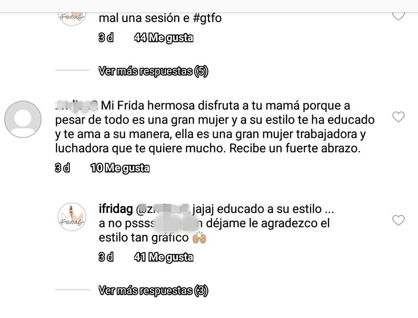 Ante las decenas de comentarios que acompañaron la imagen de Día de las Madres, Frida Sofía respondió a la mayoría de ellos, casi a todos en el tenor de querer salir adelante.
