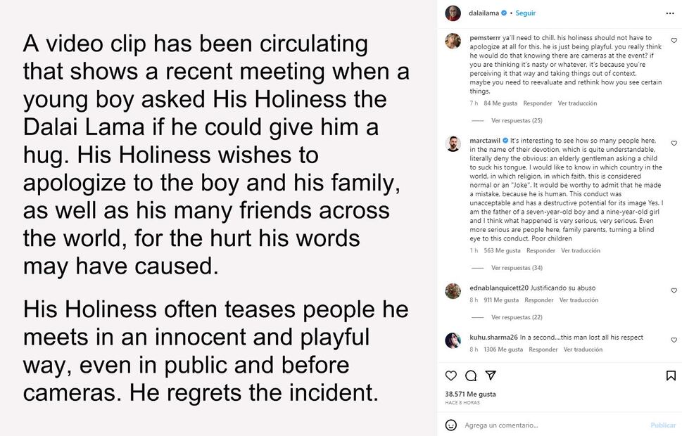 La reprobable acción de Tenzin Gyatso, de 87 años, ocurrió en un evento público en febrero pasado en el templo Tsuglakhang de Dharamsala, donde vive exiliado. El Dalái Lama estaba escuchando preguntas del público cuando el niño preguntó si podía abrazarlo. El hombre, que podría ser vinculado a varios delitos, invitó al niño a la plataforma donde estaba sentado. En el video, señala hacia su mejilla, tras lo cual el niño lo besa y lo abraza.