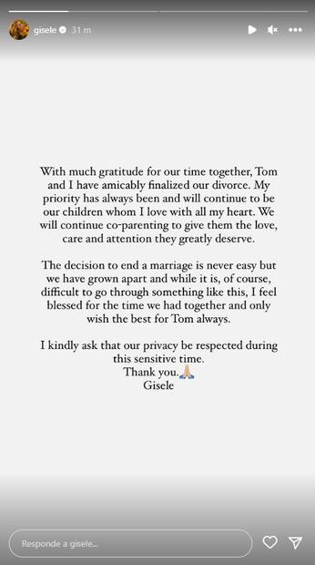 Gisele Bündchen y Tom Brady confirnaron su divorcio y en un breve comunicado, la pareja aseguró que en medio de su separación tras 13 años de matrimonio, su prioridad son sus hijos. La superodelo señaló: "Mi prioridad siempre ha sido y seguirá siendo nuestros hijos a quienes amo con todo mi corazón".