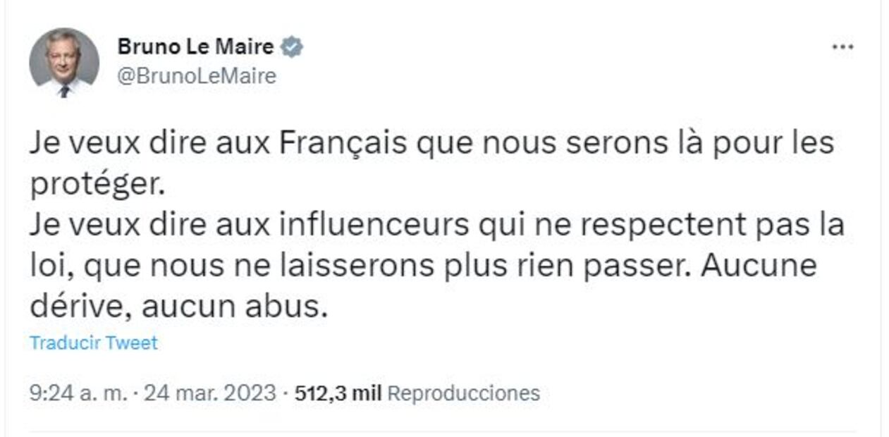 Le Maire también abordó la lucha contra la publicidad fraudulenta o de productos, como el alcohol, que se hacen en ciertos canales y comunicó que se ha creado una "brigada de la influencia comercial", que cuenta con 15 agentes para evitar esas prácticas.
