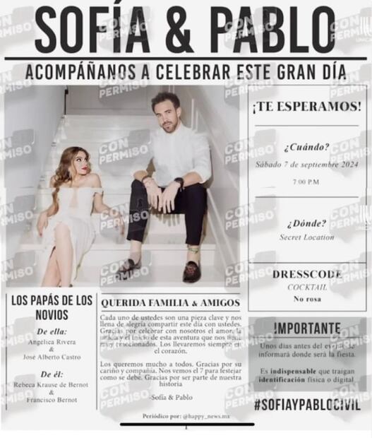 Aunque en primera instancia el papá de Sofía Castro no compartió sí este sábado sería su boda civil o religiosa, fue hace tan solo unas horas cuando comenzó a circular en redes sociales la invitación que los novios hicieron llegar a su invitados y en la que se confirma que este 7 de septiembre a las 7:00 pm celebrarán su boda civil.