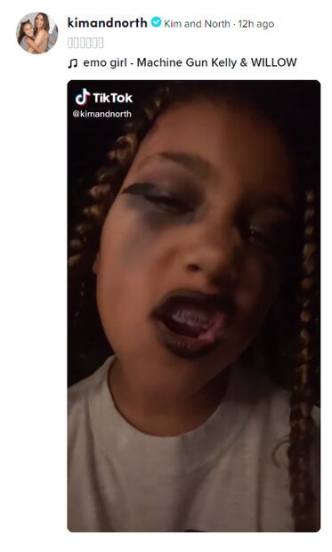 North West, de 8 años y con brackets, compartió un nuevo TikTok, en el que canta con su prima Penélope (hija de Kourtney Kardashian) y su mamá, Kim Kardashian, de 41 años, todas con maquillaje totally emo y entonando con fuerza el tema "Emo Girl", de Machine Gun Kelly y Willow Smith.