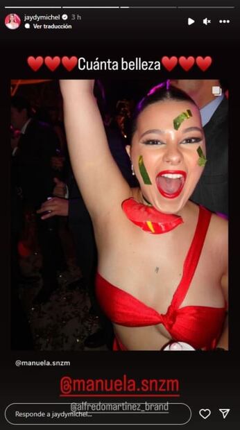 Agregando tacones de plataforma dorada, un bolso en forma de corazón, anillos, pulseras, flores para decorar su cuello y su peinado recogido además de un maquillaje en el que destacan sus labios rojos, Manuela fue elogiada por derrochar completo estilo, un gusto heredado por su deslumbrante mamá, quien también la presumió orgullosa en sus redes sociales.