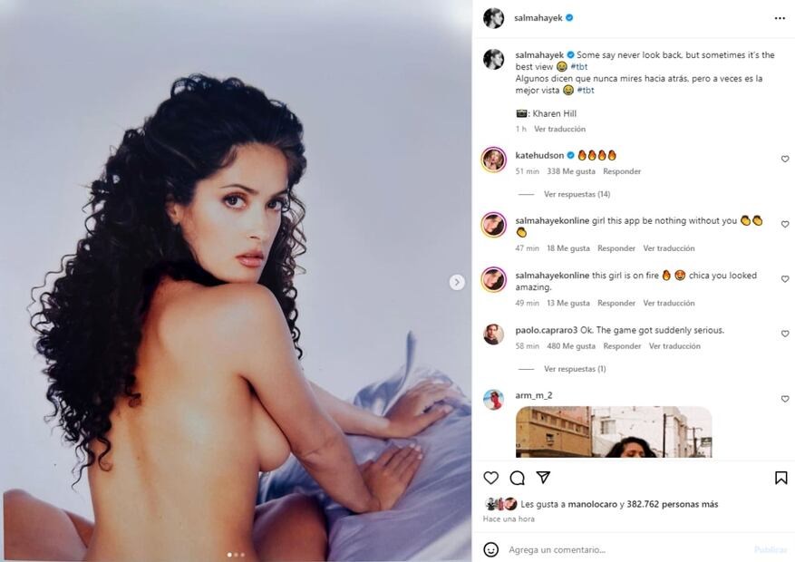 Actrices como Blake Lively, la modelo Kate Hudson y la socialité Lauren Sanchez, prometida de Jeff Bezos, son algunas de las amigas de Salma Hayek que han aparecido en su caja de comentarios para elogiar su posado.