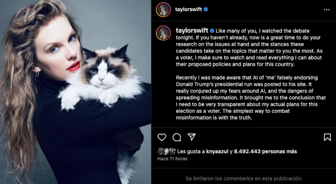 Su mensaje continuó haciendo referencia a Trump y las fotografías falsas compartidas hace unas semanas; “Recientemente me di cuenta de que estaba apoyando falsamente la carrera presidencial de Donald Trump. Realmente evocó mis miedos alrededor de la inteligencia artificial y los peligros de difundir información errónea. Me llevó a la conclusión de que necesito ser muy transparente sobre mis planes reales para esta elección como votante. La forma más simple de combatir la desinformación es con la verdad”.
