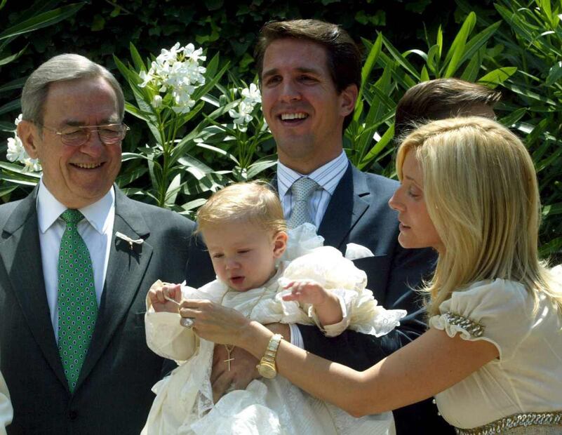(Pablo de Grecia, Marie-Chantal Miller y Constantino II de Grecia posan con el pequeño Odiseas-Kimon, quien fue bautizado en el Monasterio de San Juan, en Carea, Grecia. Foto de 2005 / EFE)