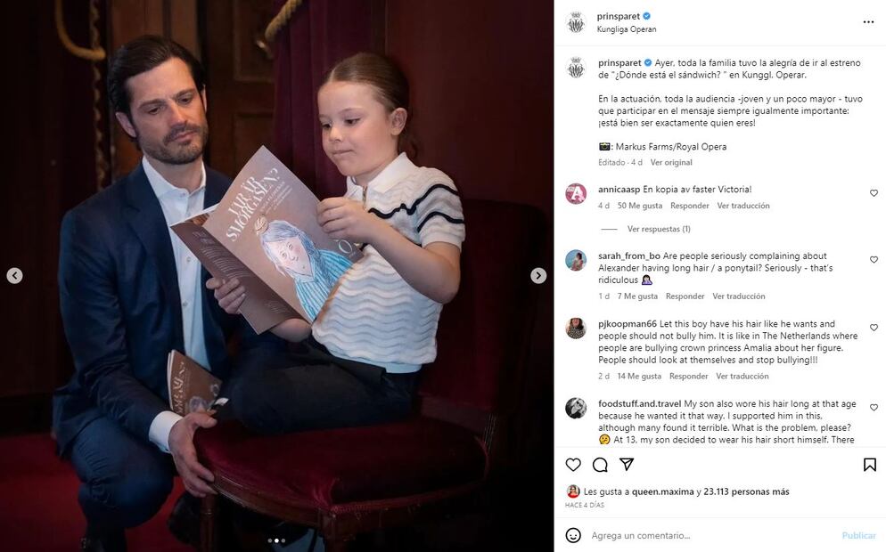 "¿La gente se está quejando en serio de que Alexander tiene el pelo largo en una coleta? En serio, eso es ridículo", "¡Una réplica de la tía Victoria!", "Alexander es lo suficientemente mayor como para elegir su propio peinado, si quiere cabello largo, déjenlo y confíen en que sus padres hacen lo mejor para él", son algunos comentarios que salieron en defensa del pequeño príncipe y nieto de los reyes Carlos XVI Gustavo de Suecia y Silvia de Suecia.