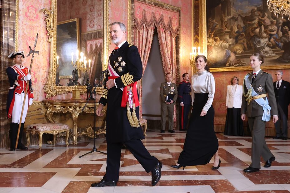 El rey no se quedó atrás e igualmente vistió su uniforme de Capitán del Ejército de Marina. Por su parte, la reina Letizia fue otra de las protagonistas de la tarde, luciendo hermosa con un look elegante conformado por dos piezas, una falda negra de la firma Boüret, una blusa satinada en tono champagne, zapatos negros de tacón bajo y algunas joyas vintage para complementar su vestimenta. Para terminar su outfit agregó una capa de punto con pelo sintético de Carolina Herrera.