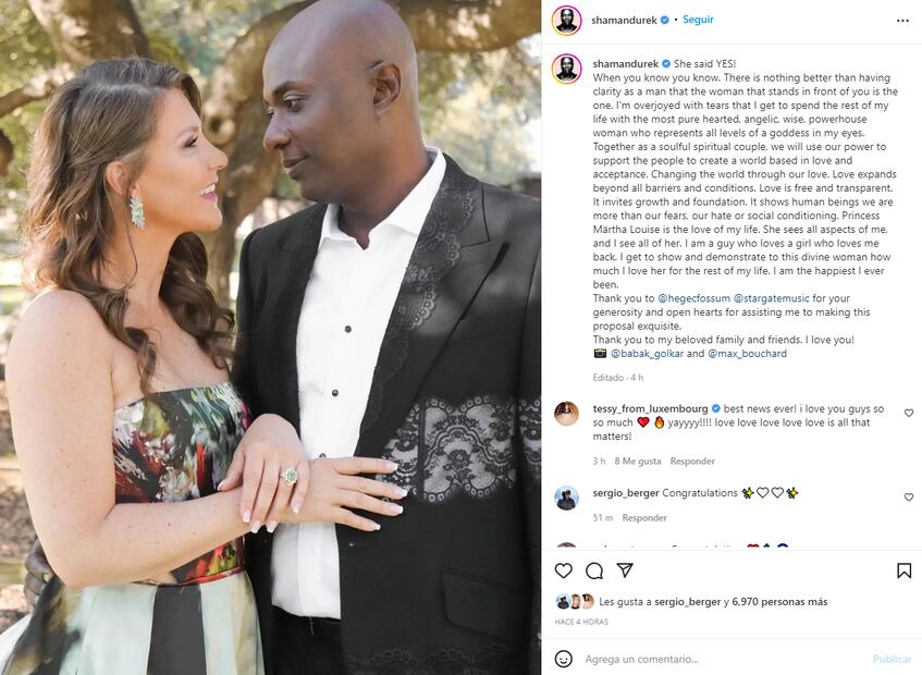Marta Luisa, hija de los reyes de Sonja Haraldsen y Harald V de Noruega, anunció su compromiso con el autoproclamado chamán Durek Verrett, con quien tiene más de dos años de una polémica relación. La princesa es hermana del futuro rey Haakon de Noruega y es la cuarta en la orden de sucesión al trono.