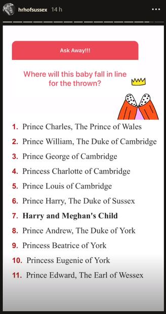 En la fan account de Meghan y Harry en Instagram, se subieron un par de historias en las que la exactriz respondió a la pregunta del nacimiento de su primer bebé y dijo: “Finales de abril, inicios de mayo”.